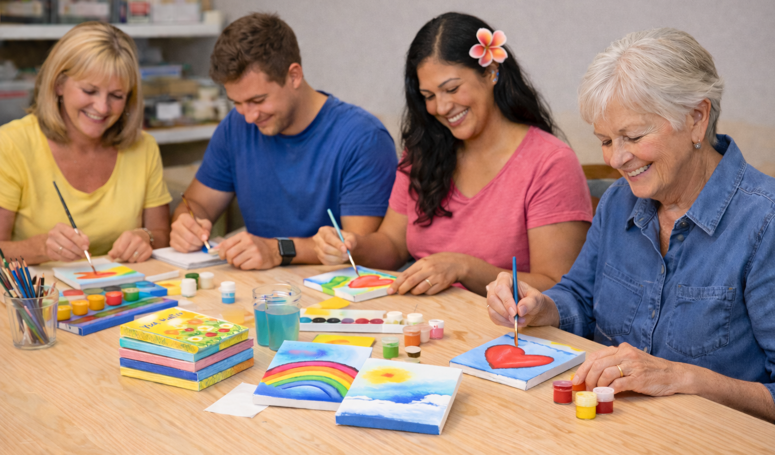 Host a small gathering at home to decorate 6 × 6 non-toxic, acid-free canvas panels with encouraging messages and cheerful artwork, following our 6 × 6 Canvas & Card Guidelines.